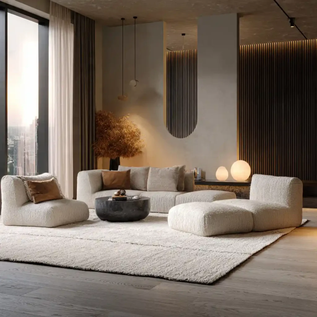 A generously sized rug helps unify sofas, chairs, and tables into one cohesive zone. It visually expands the room and prevents furniture from feeling disconnected. This approach is especially effective in open-plan layouts.