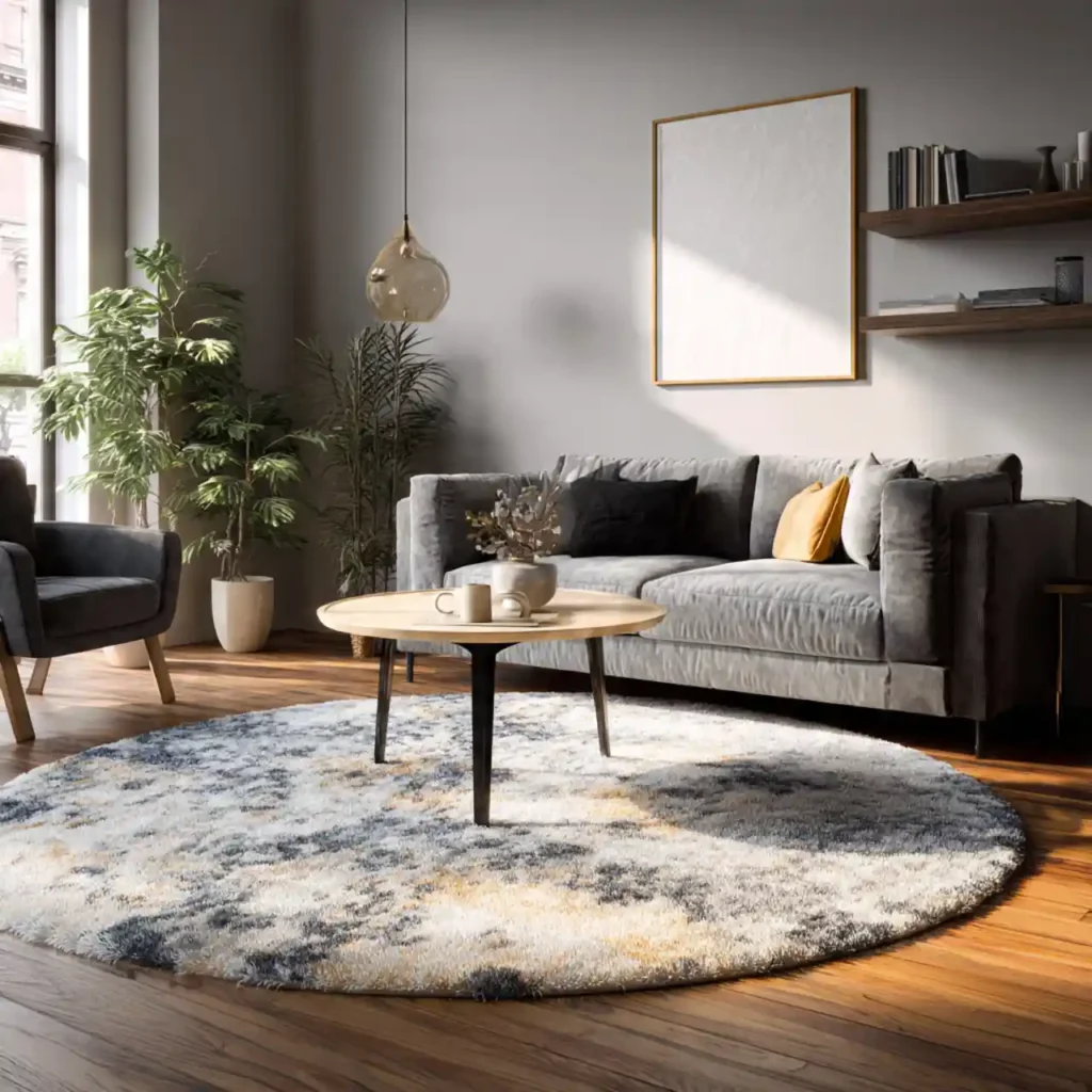 Round rugs help soften boxy furniture arrangements. They work especially well in smaller living rooms or under coffee tables. This shape adds balance and flow.