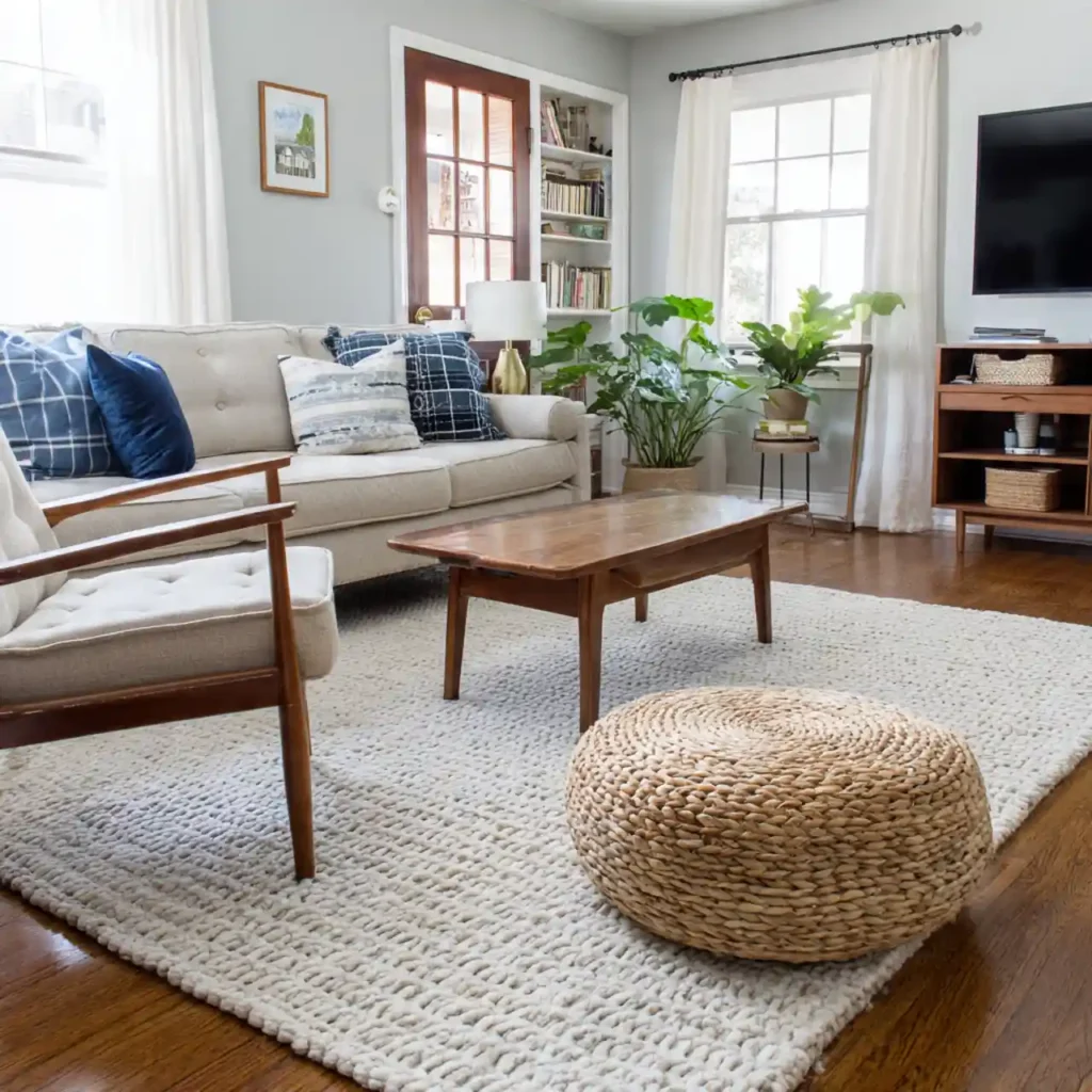 Flatweave rugs are lightweight, durable, and easy to clean. They work well in family-friendly living rooms. Their low profile keeps spaces feeling open.