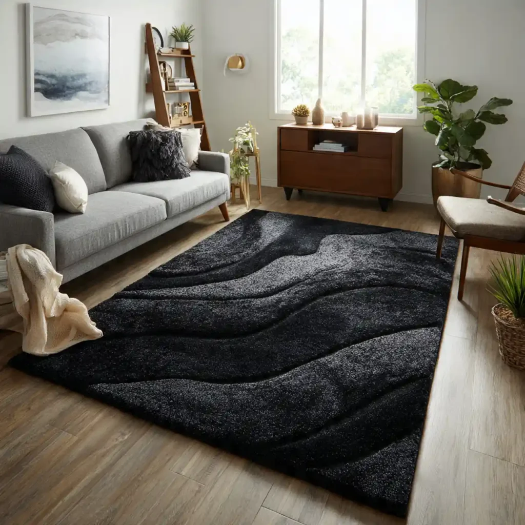 Black rugs ground a space and create dramatic contrast. They work best in well-lit living rooms with lighter furniture. This choice adds modern elegance.