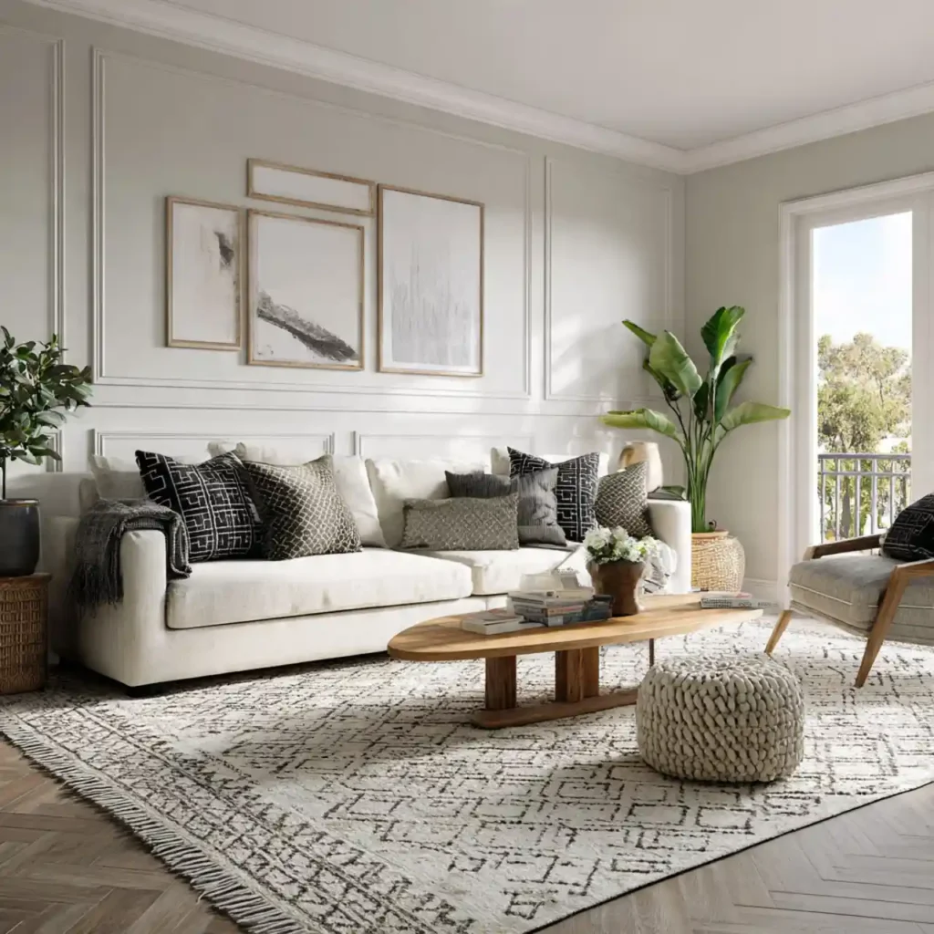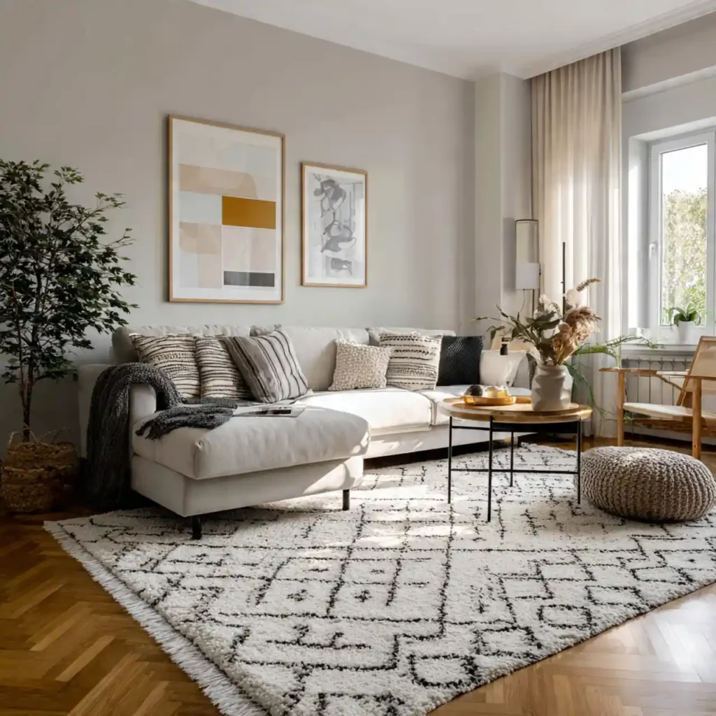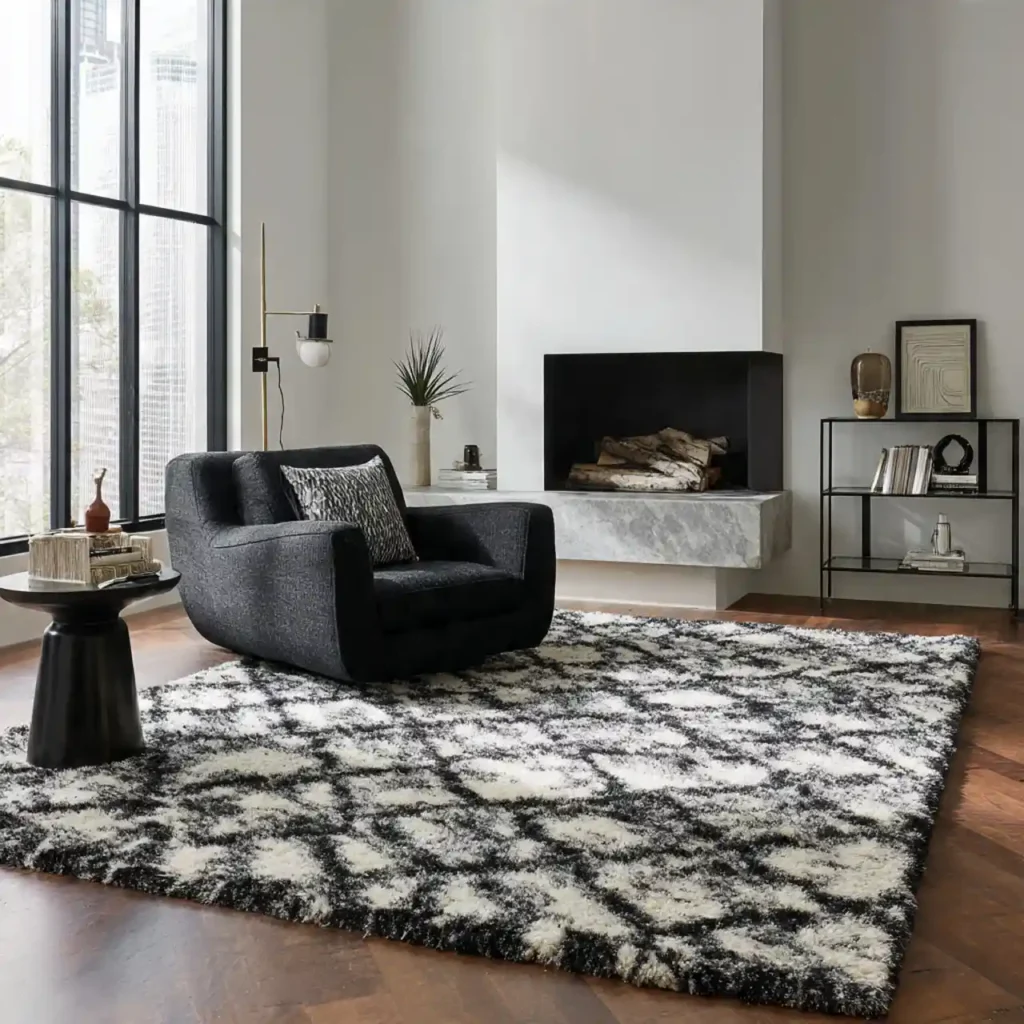 A black-and-white rug creates contrast while maintaining visual harmony. It complements minimalist and modern interiors effortlessly. This option keeps the space grounded and stylish.