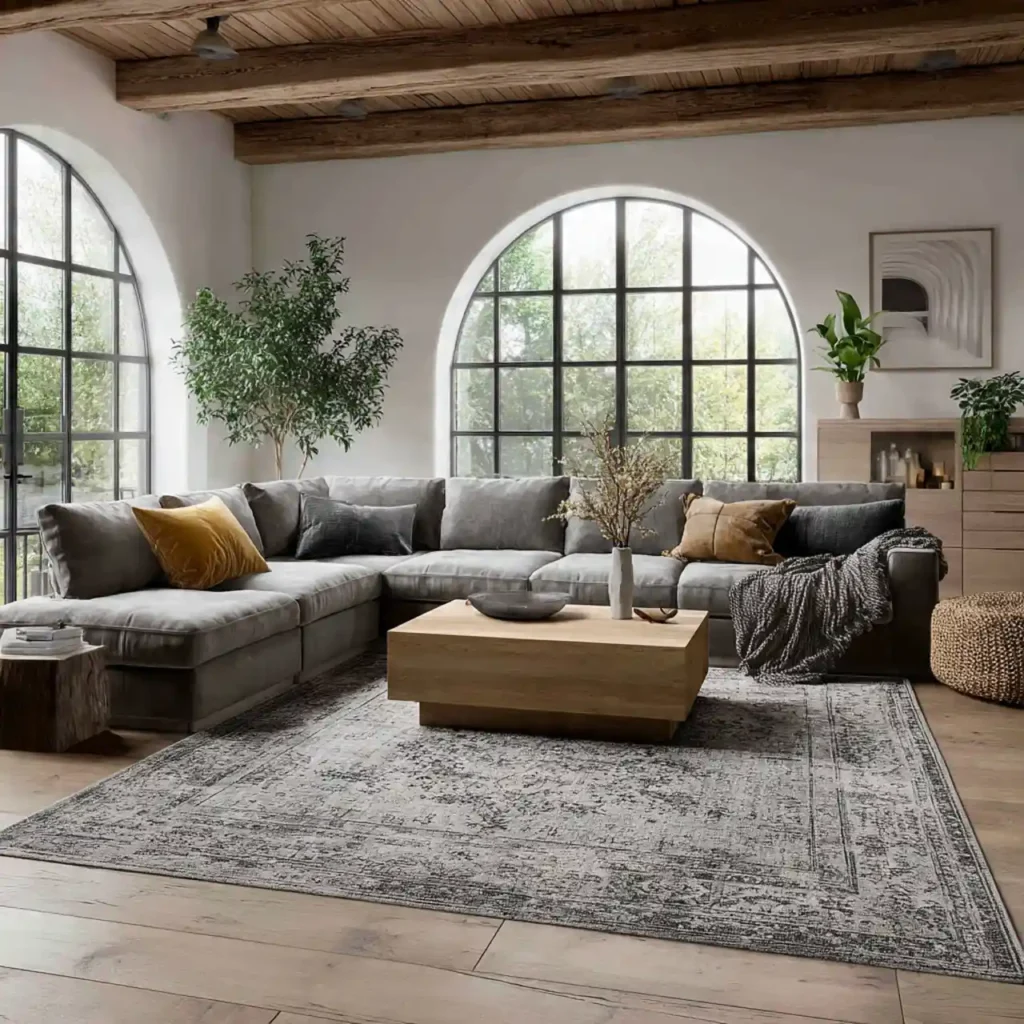 Oversized rugs define seating areas in large living rooms. They prevent spaces from feeling empty or disjointed. This approach improves flow and balance.