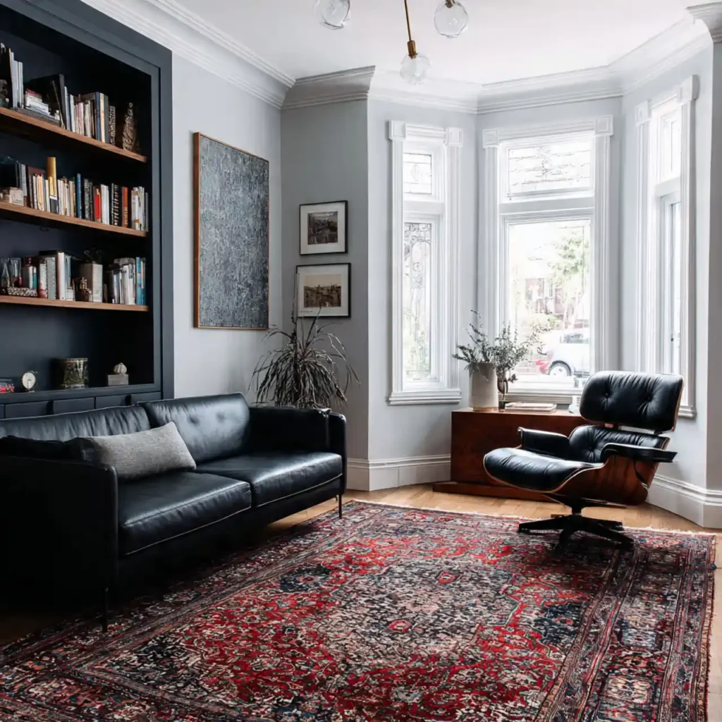 A bold rug in navy, emerald, or mustard becomes the room’s focal point. It energizes neutral furniture and walls. This approach adds confidence and personality.