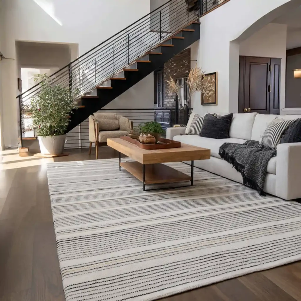 Striped rugs guide the eye and elongate the space. Neutral stripes keep the look subtle and balanced. This works well in narrow living rooms.